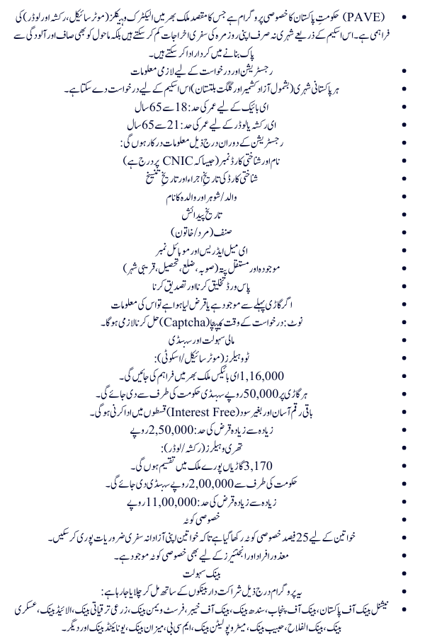 Pakistan Accelerated Vehicle Electrification Program (PAVE) is a government-led initiative under the New Energy Vehicle Policy 2025–30 to promote electric mobility in Pakistan. The program focuses on reducing environmental pollution, cutting fuel costs, and introducing affordable eco-friendly transportation. In its first phase (2025–26), it will provide 40,000 electric motorcycles, 1,000 rickshaws, and 1,000 three-wheelers with high subsidies and easy installments. Special quotas are reserved for women, disabled individuals, and overseas Pakistanis, while local EV manufacturing and job creation will also be supported. In this article, we are sharing all the details about the Pakistan Accelerated Vehicle Electrification Program registration process, Eligible Criteria, Documents required, Helpline and all other details.