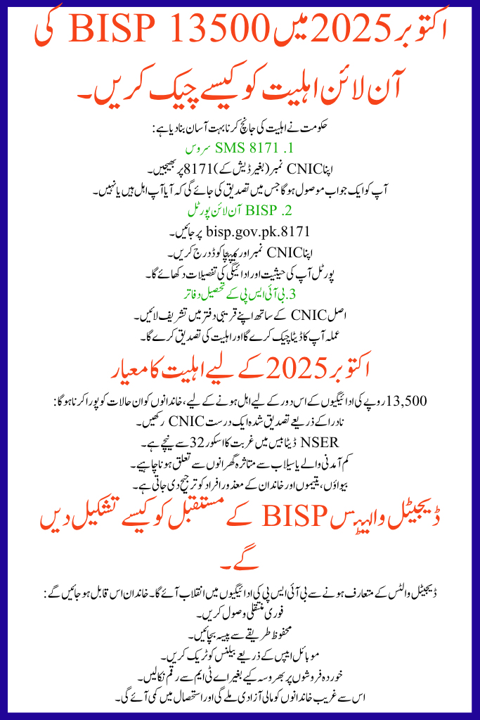 The BISP 13500 October 2025 Payment is a big respite for thousands of Pakistani families. Cover 53 districts, the new phase introduces digital accounts and better slide. To receive your sum smoothly, make sure your CNIC is updated, check suitability via 8171 or online portal, and prefer ATMs/digital accounts over retailers to avoid fraud.