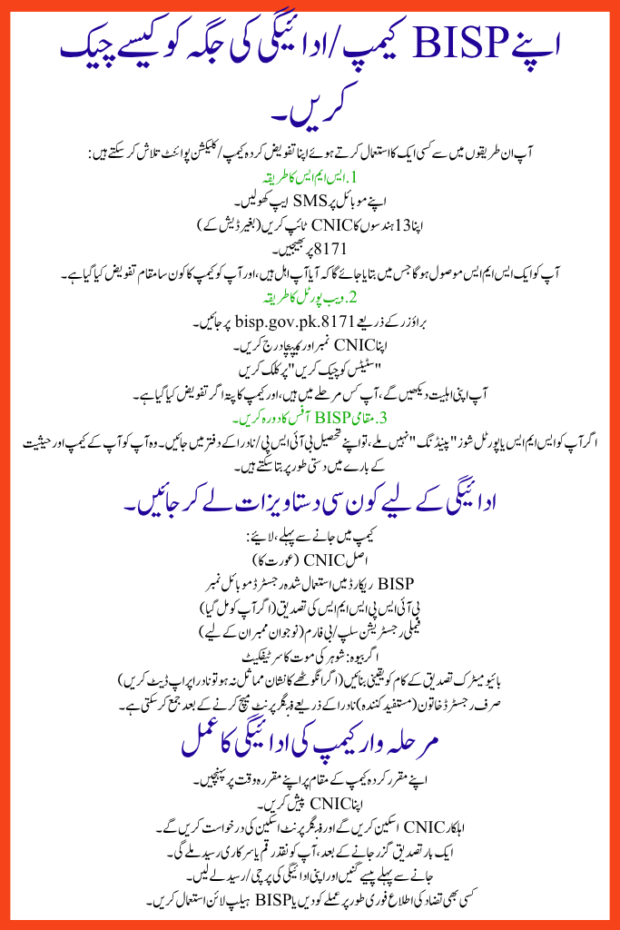 If you did not get SMS or portal shows “pending”, visit your Tehsil BISP / NADRA office. They can tell you about your camp and status manually.