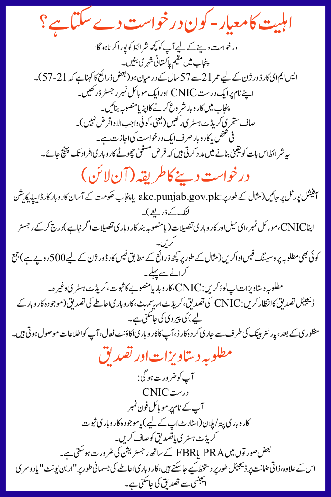 As of 2025, the scheme details are active on official Punjab government portals. The card version for small entrepreneurs (up to PKR 1 million) is clearly defined; the related “Asaan Karobar Finance” scheme covers larger SMEs with higher limits. Applicants should check the portal for the latest open registration cycle because phases may vary.