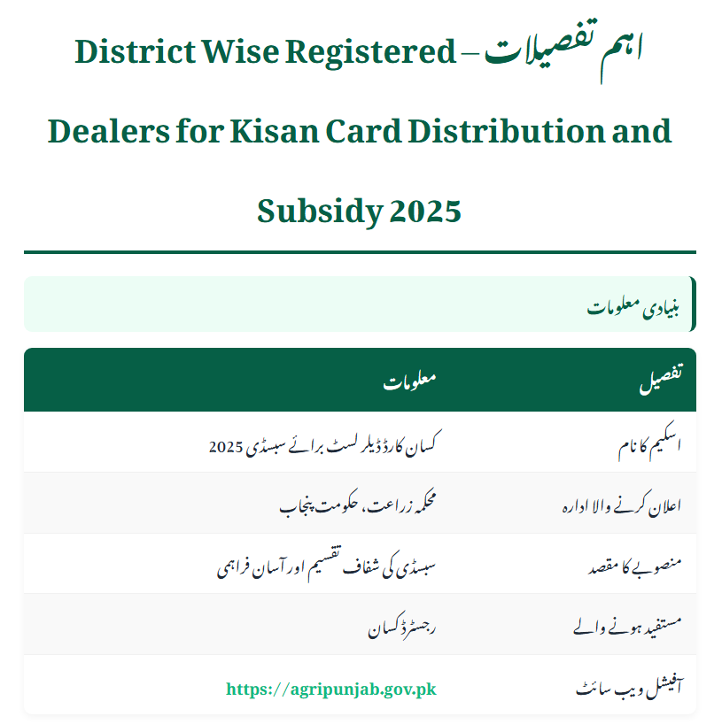 The District Wise Registered Dealers for Kisan Card Distribution and Subsidy 2025 is part of Punjab’s broader plan to digitalize the agriculture system and make subsidy distribution fair and transparent.