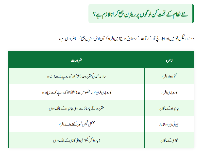 Under the current tax laws and FBR rules, certain categories of taxpayers must file returns online. Here are the main eligibility conditions: