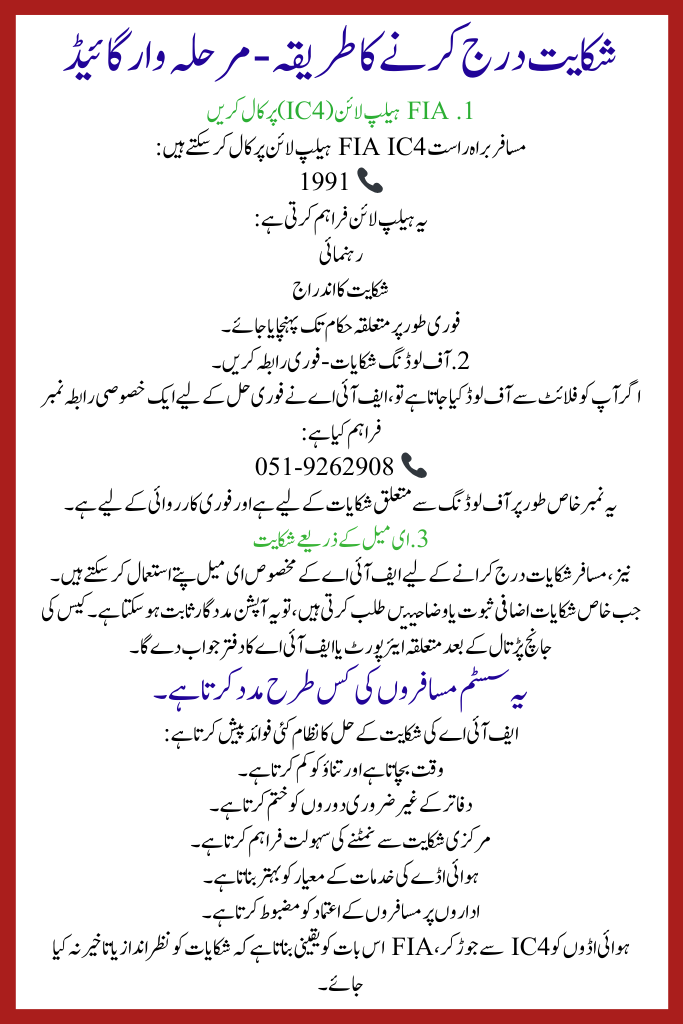 The launch of the FIA Complaint Resolution System at Airports is a positive step toward improving passenger facilitation in Pakistan. With the IC4 helpline (1991), dedicated offloading contact number, and email support, passengers now have multiple reliable ways to raise concerns. This system is active, efficient, and designed to serve travelers in real time.