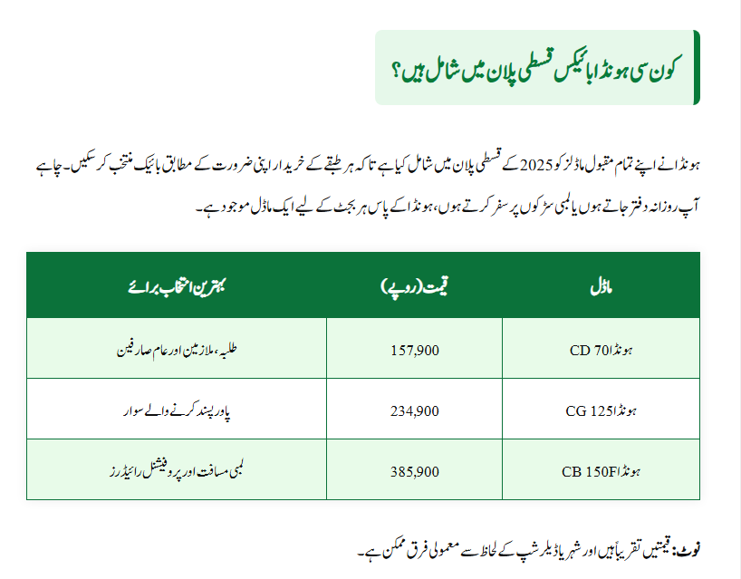 | Honda CD 70 | Rs. 157,900 | Students and daily commuters |