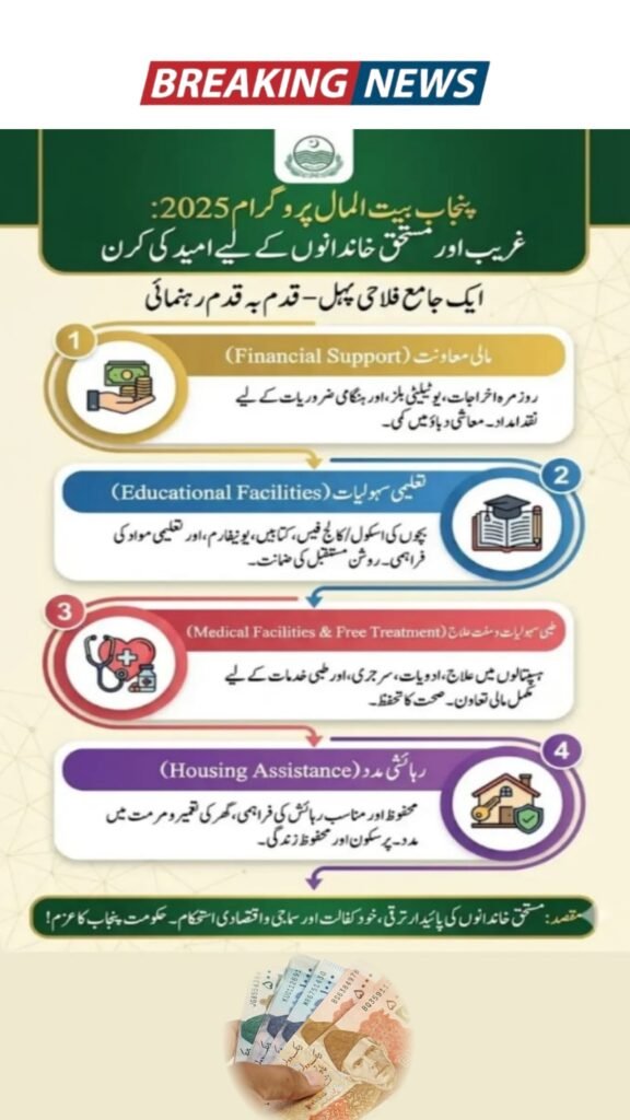 Punjab Bait-ul-Maal 2025 is a major Punjab Government welfare program designed to support low-income families, poor households, and deserving individuals struggling with daily expenses, medical emergencies, education costs, and unsafe housing conditions. This program focuses on financial assistance, educational support, healthcare aid, and secure housing, making it one of Punjab’s most important social protection initiatives in 2025. The objective is to provide immediate relief and also create long-term stability for families facing poverty. The official information updates are available on the Punjab Government’s welfare page: https://baitulmaal.punjab.gov.pk.