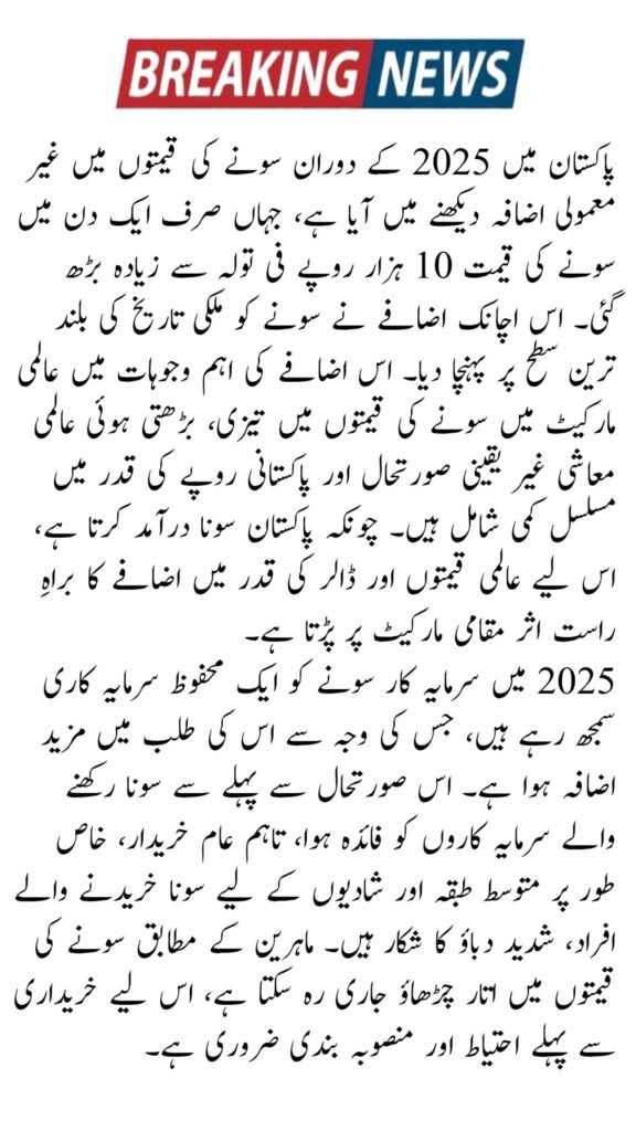 Gold prices in Pakistan 2025 have created a nationwide shock after increasing by more than Rs. 10,000 per tola in a single day. This sharp rise has pushed gold rates in Pakistan to the highest level ever recorded. The sudden jump in Pakistan gold prices today has affected investors, jewelers, and common citizens who buy gold for weddings, savings, and security.The gold price hike in Pakistan is not caused by one single reason. Instead, it is the result of strong global gold prices, a weakening Pakistani rupee, and rising demand for gold as a safe-haven investment. Due to this situation, the Pakistan bullion market 2025 is facing extreme volatility.