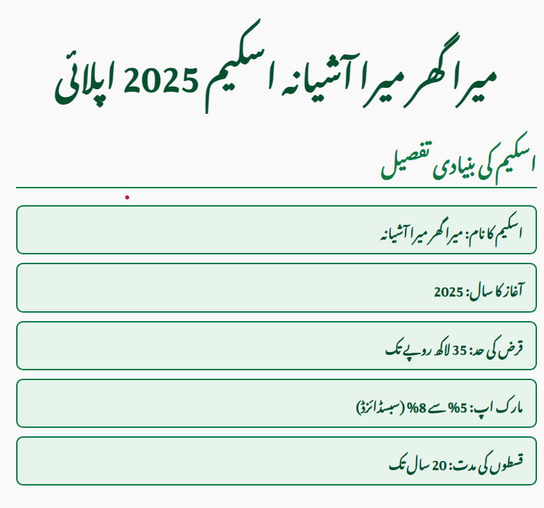 Owning a home is every family’s dream. In Pakistan, millions of people spend their lives in rented houses, while rising property prices push the dream of homeownership further away. At such a time, the Government of Pakistan has introduced a golden chance through Mera Ghar Mera Ashiana Scheme 2025 Apply. This program makes it possible for low- and middle-income families to buy or build their own homes with affordable loans and easy repayment plans.