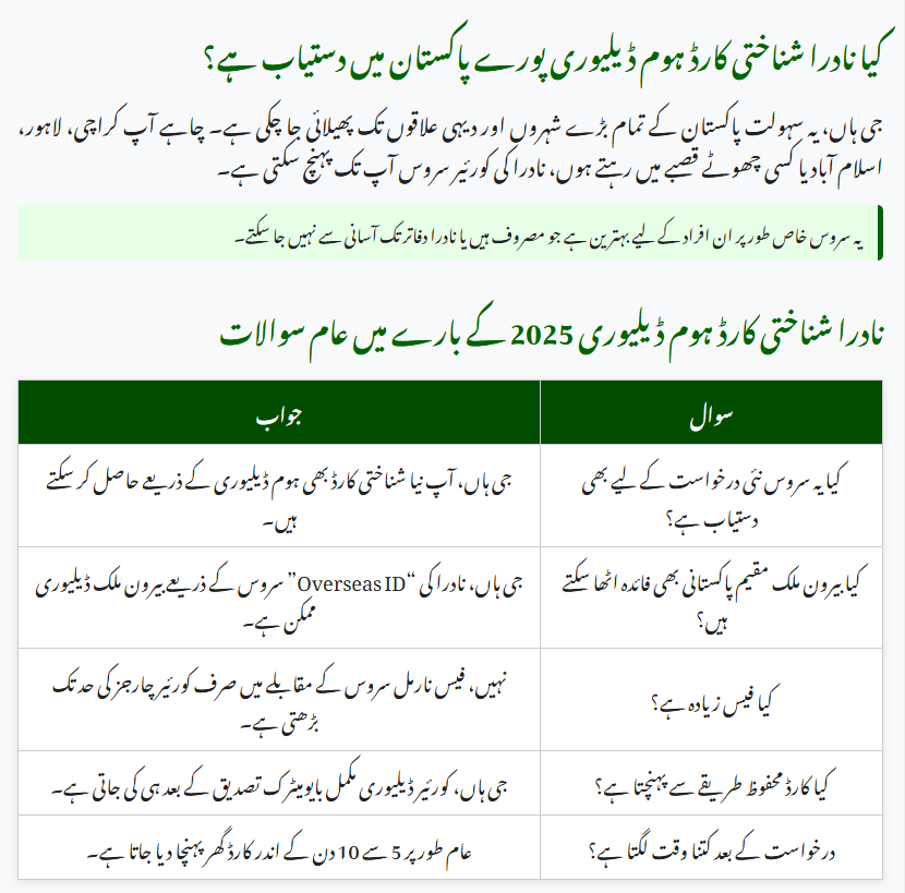 | Can overseas Pakistanis use this service? | Yes, NADRA’s “Overseas ID” service allows delivery abroad as well. |