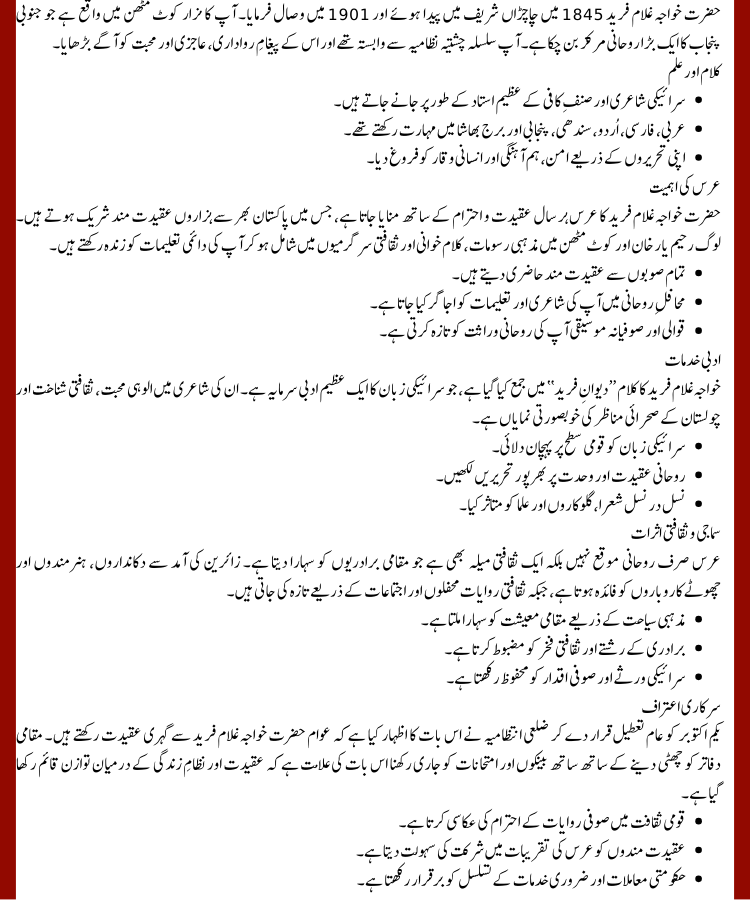 The Urs of Khawaja Ghulam Fareed is observed every year with devotion, attracting thousands of devotees from across Pakistan. People gather in Rahim Yar Khan and Kot Mithan for religious rituals, poetry recitations, and cultural activities that reflect his enduring influence.